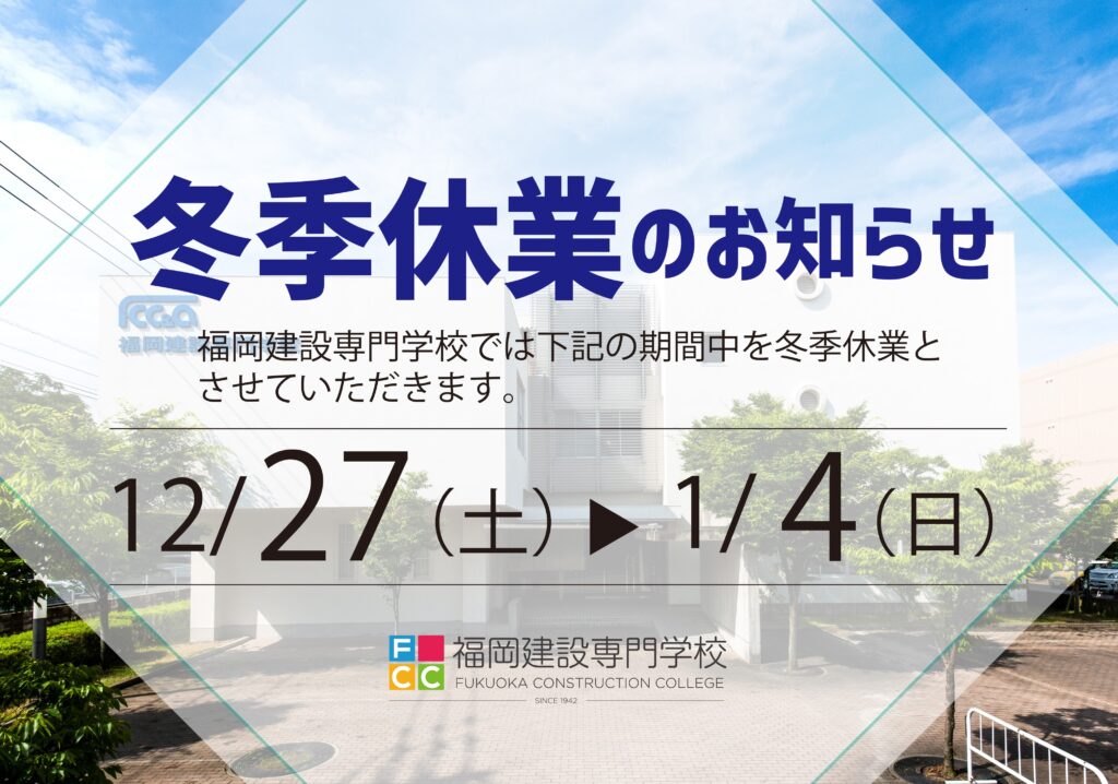 福岡建設専門学校では下記の期間を冬季休業とさせていただきますので、お知らせいたします。 【冬季休業期間】 2025年12月27日(土)~2026年1月4日(日) ◆休業中でもHPでは資料請求やオープンキャンパスの予約を受 […]